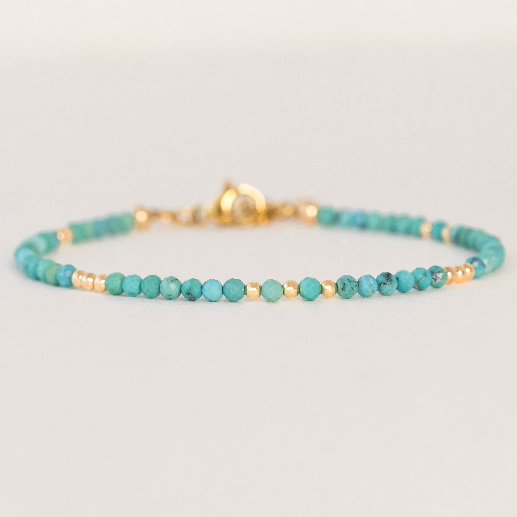 This dainty Turquoise Bracelet features genuine Arizona Turquoise beads, known for their distinct green blue hue. Celebrating December’s birthstone, Turquoise is a symbol of truth and inner wisdom. Handmade in the UK with care, this adjustable bracelet is available in Sterling Silver, 14K Gold Filled, and Rose Gold Filled, making it a beautiful and meaningful accessory for any occasion.