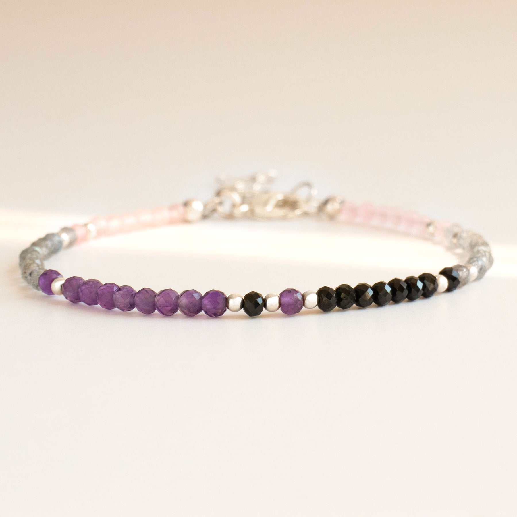 Our Empath Protection Bracelet is a dainty bead bracelet crafted with black tourmaline, labradorite, amethyst, and rose quartz. Designed to offer protection and balance for empaths. These crystals are believed to help absorb and transmute negative energy. It is available in Sterling Silver, 14K Gold filled, and Rose Gold filled options.