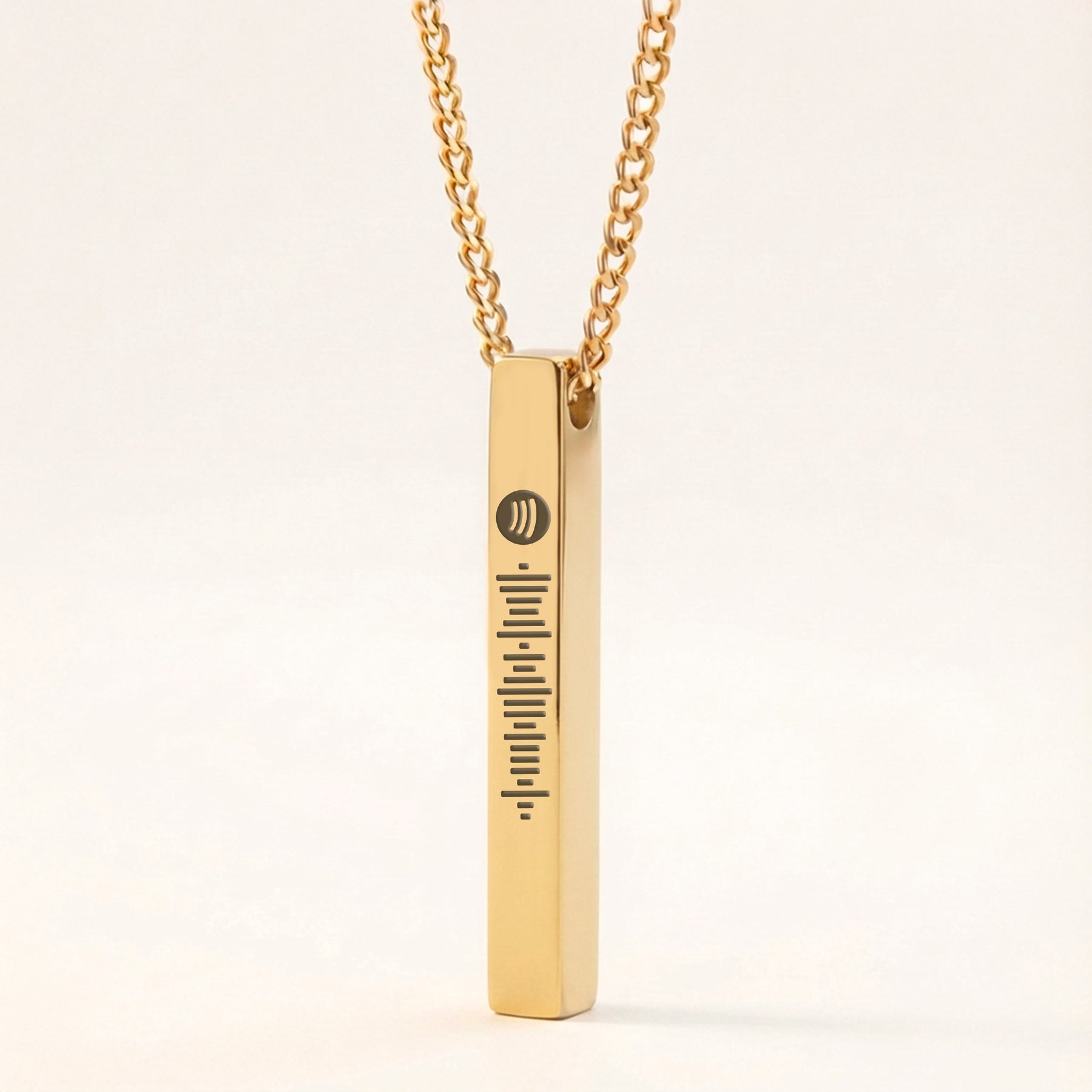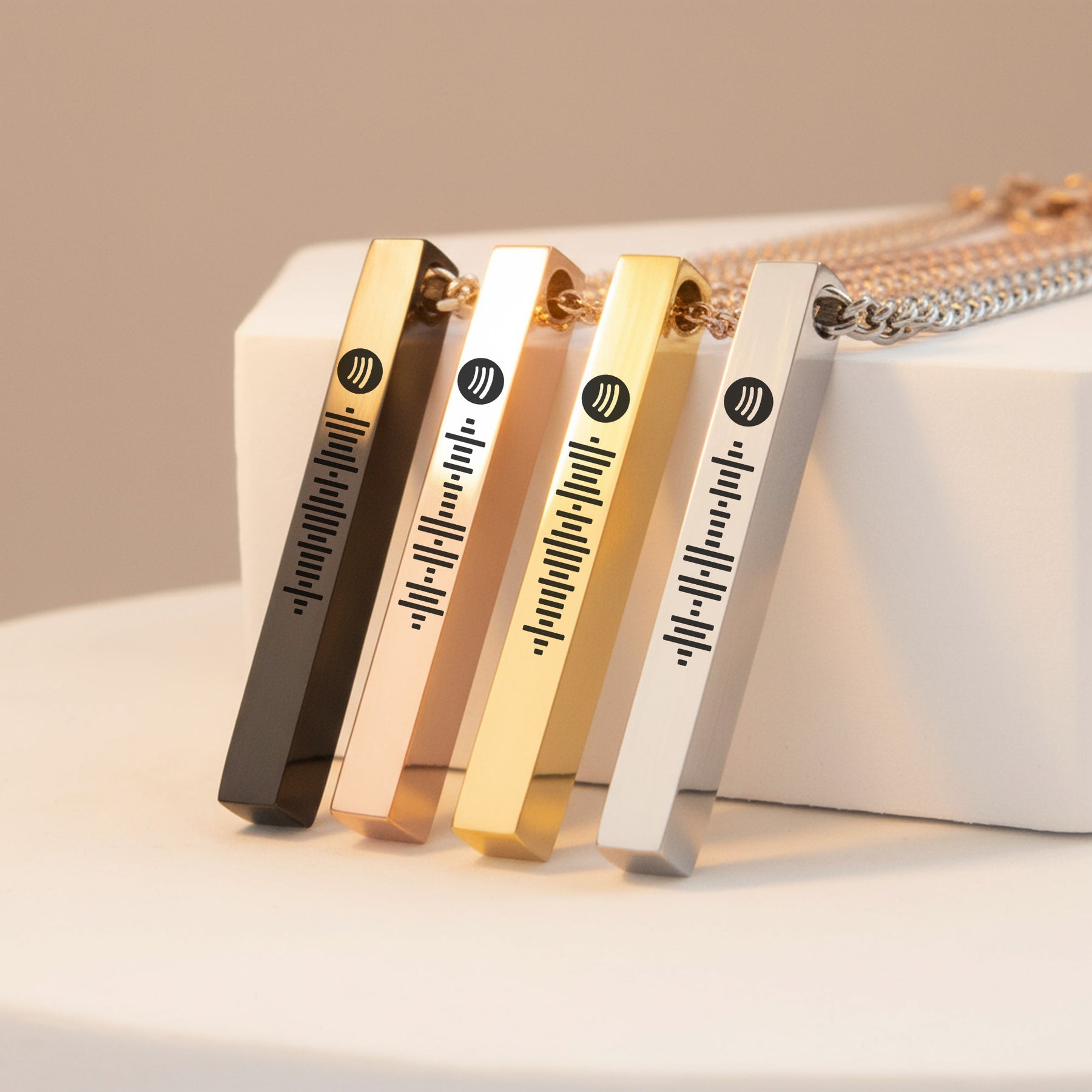 Our Spotify Necklace captures your favourite song as a scannable code on a sleek bar pendant, keeping that memory right against your heart.
