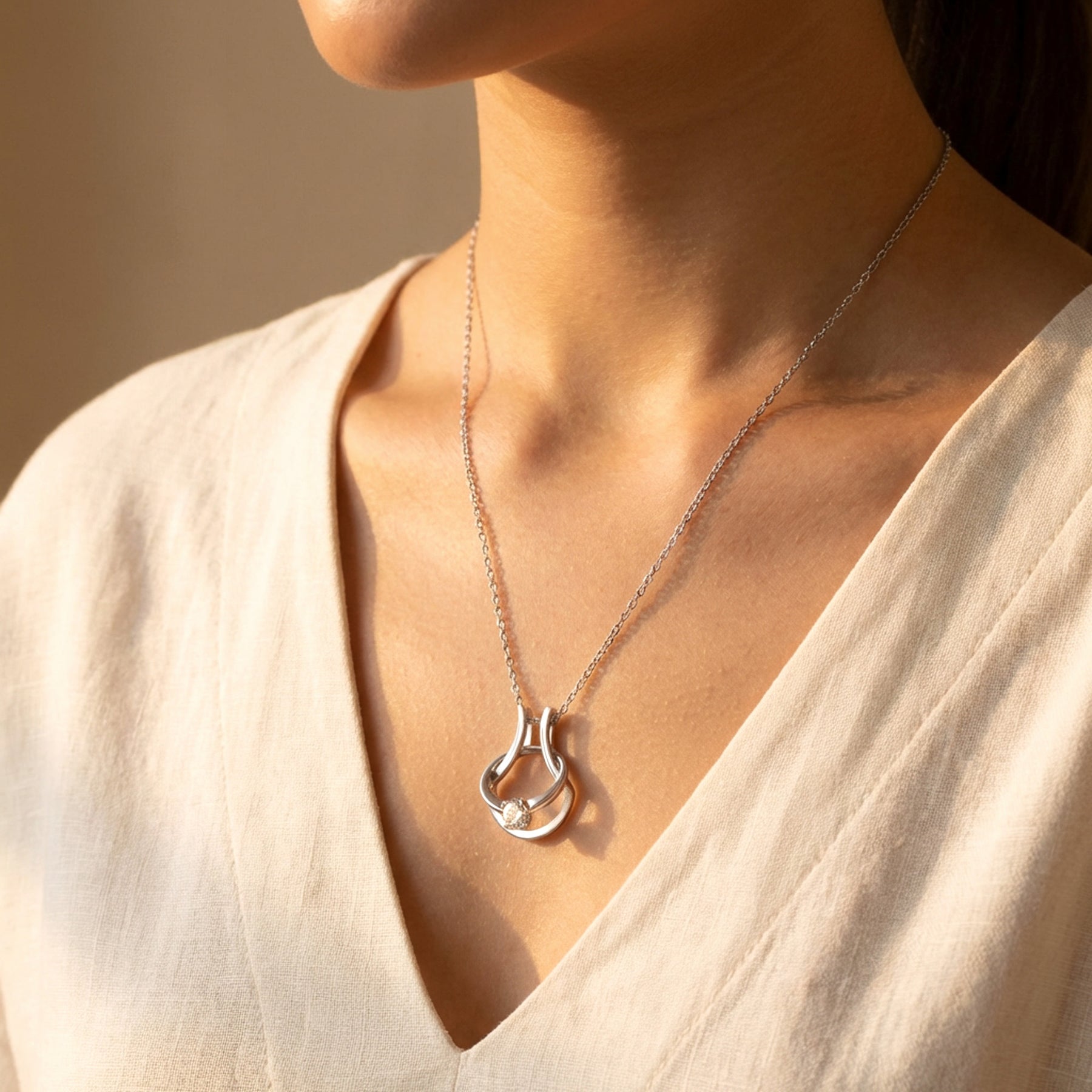 Woman wearing minimalist silver ring holder necklace with ring on pendant