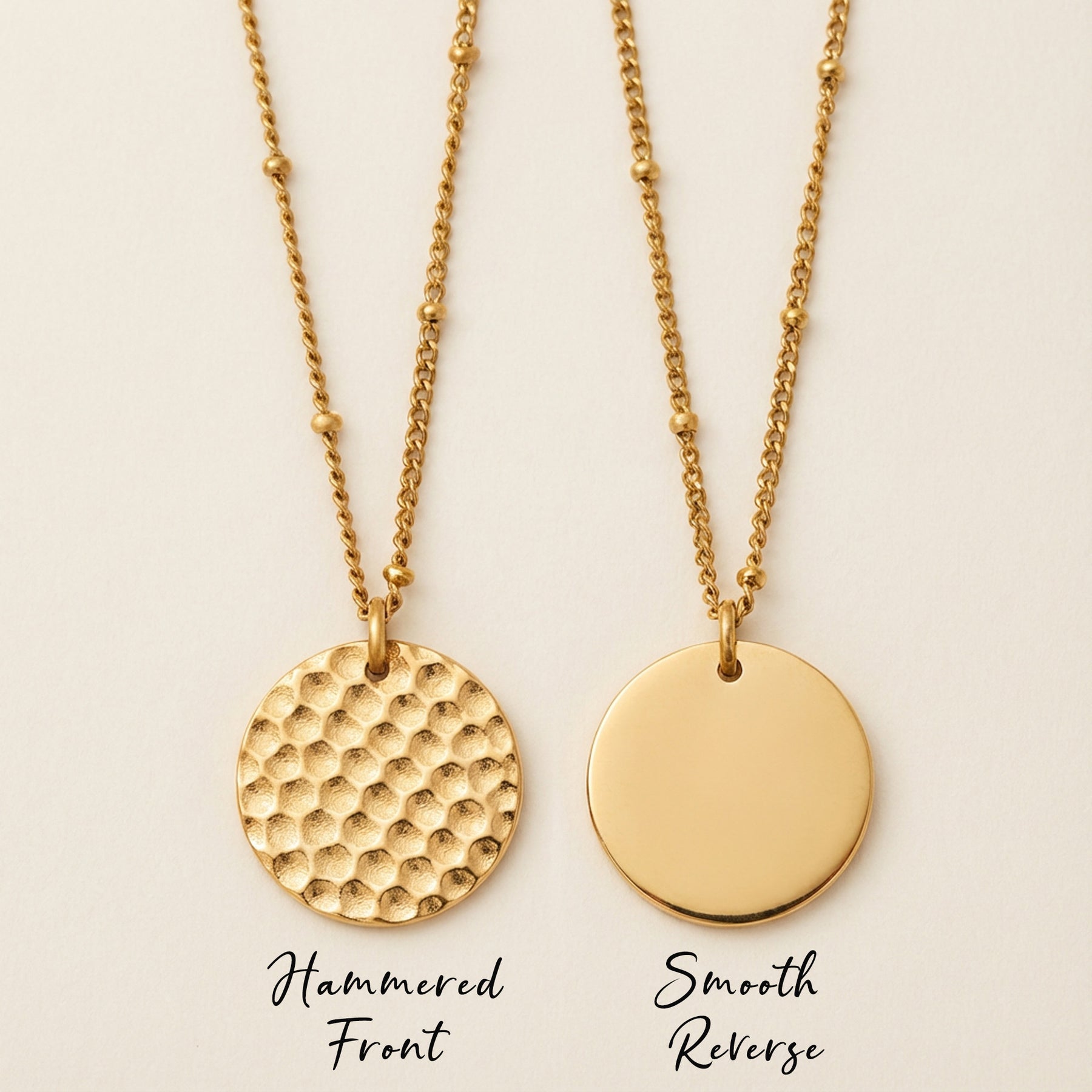A quietly meaningful piece with a little secret just for you. Our hidden message necklace features a softly shimmering hammered disc on the front and a smooth reverse, custom engraved with your own words.