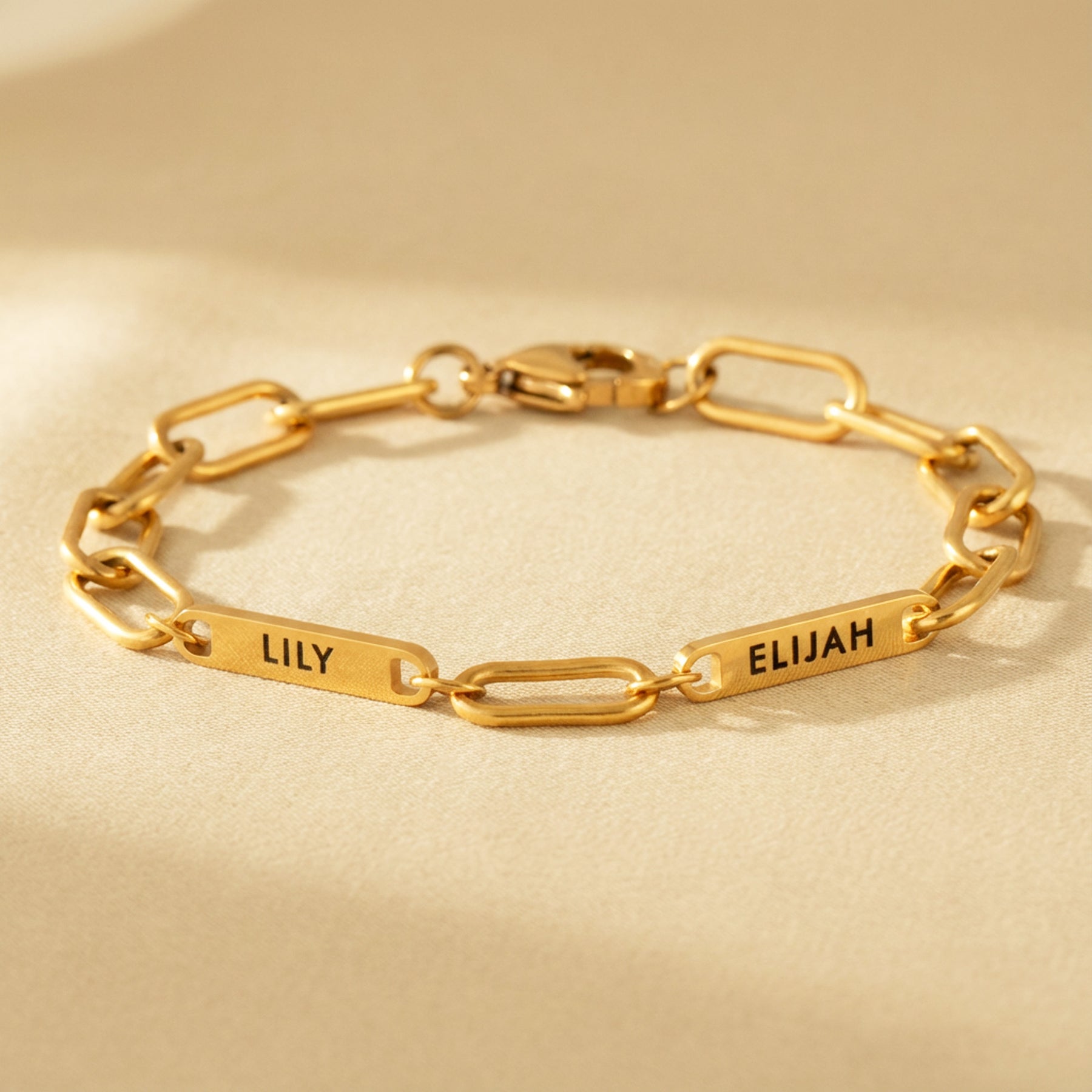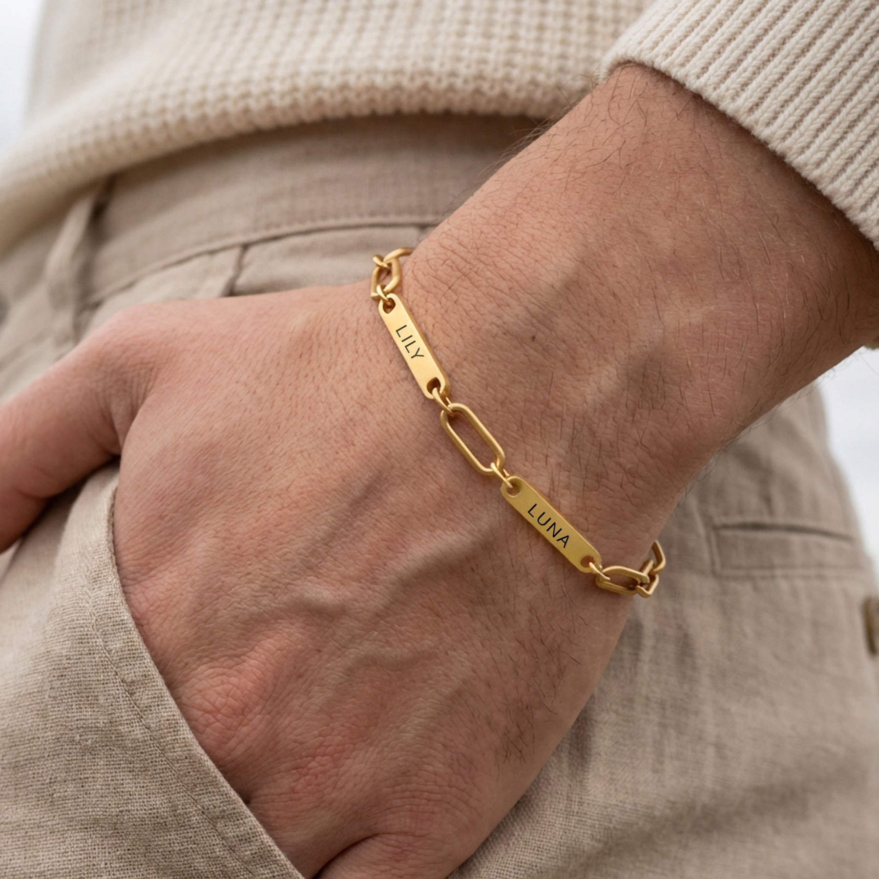 A modern mens name bracelet with quiet sentiment. This sleek paperclip chain is finished with up to two slim name plates, each engraved with a name, date or word that matters most.